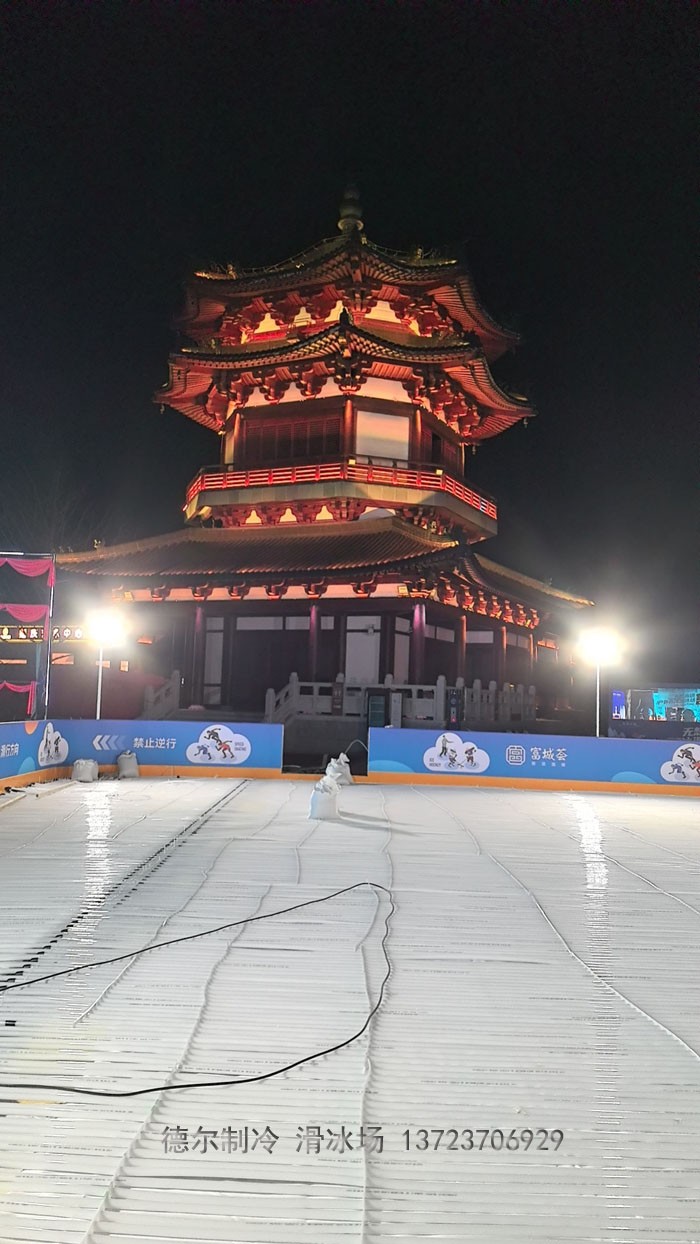 南京市溧水區(qū)無想水鎮(zhèn)富城薈室外滑冰場,建設(shè)于2024年春節(jié)前的數(shù)九寒冷天氣,在春節(jié)到來前夕,及時開業(yè),為周邊市民提供了春節(jié)期間娛樂好項(xiàng)目。該溜冰場為室外人工真冰溜冰場,由深圳市德爾制冷設(shè)備有限公司施工建造。此溜冰場為溧水區(qū)第一個室外真冰溜冰場,它位于無想水鎮(zhèn)富城薈廣場核心區(qū),古代建筑風(fēng)貌的街景與現(xiàn)代城市的消費(fèi)形態(tài)相得益彰。夜晚燈光璀璨時,映在冰面的燈光霓虹閃爍,與周邊街景構(gòu)成一幅色彩斑斕的夜色美景。