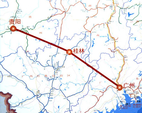 貴廣高速鐵路又稱(chēng)貴廣客運(yùn)專(zhuān)線,線路自貴陽(yáng)北站起,經(jīng)黔南州、黔東南州、廣西桂林、賀州、廣東云浮、肇慶、佛山終至廣州南站。