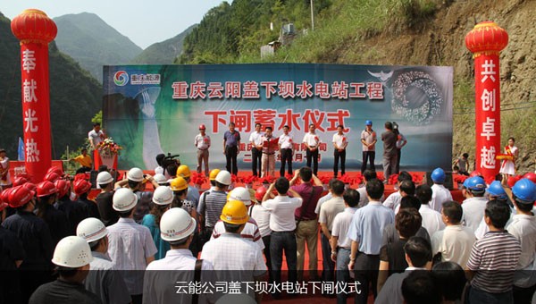 2012年8月10日,重慶云能投資興建的重慶市云陽(yáng)縣蓋下壩水電站工程成功下閘蓄水。10時(shí)18分,隨著云陽(yáng)縣委書記李洪義的一聲令下,巨型閘門穩(wěn)穩(wěn)落在導(dǎo)流洞進(jìn)口閘槽底部后,下閘蓄水宣告圓滿成功。