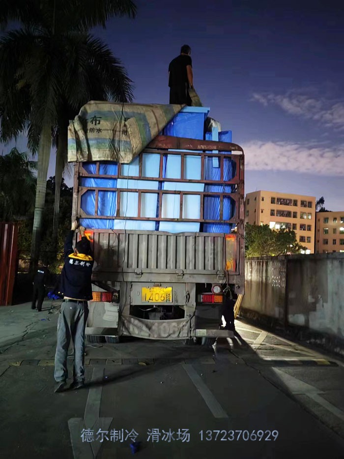 冰場設(shè)備及材料裝車發(fā)運照片。圖為設(shè)備與材料從深圳德爾制冷公司裝車,即將發(fā)運到南京溧水區(qū)無想水鎮(zhèn)富城薈廣場。